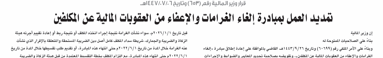أصدر وزير المالية قرارًا بتمديد العمل بمبادرة «إلغاء الغرامات والإعفاء من العقوبات المالية عن المكلفين» لمدة ستة أشهر إضافية، ابتداءً من 1/1/2026م، وذلك استمرارًا لنهج التيسير على المكلفين وتشجيعهم على تصحيح أوضاعهم الزكوية والضريبية والجمركية.